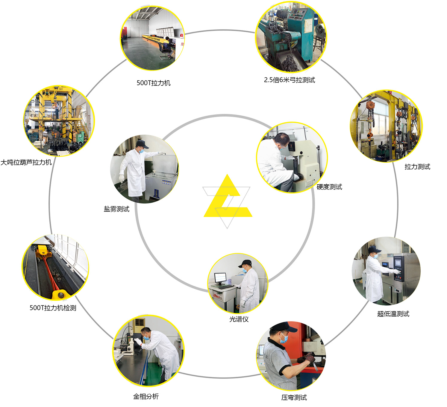 2011年起,投入資金2000萬元建立了集團公司質量檢測中心,其中,智 能化吊帶抗磨測試儀、智 能化材料分析儀、大噸位拉力機、萬 能拉力機、拉力試驗設備,化學成分分析設備,硬度測試設備,鹽霧設備,超低溫測試設備等檢測設備,具有全 國先進的技術水平,公司的先進檢測設備,在原材料檢驗、材質分析、產品過程控制、拉力試驗和成品出口抽檢等環節實現了有效的全過程科學控制,確保實現了產品的批合格率。